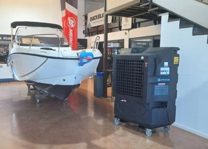 Rafraichisseur d'air dans un entrepôt de vente de bateaux